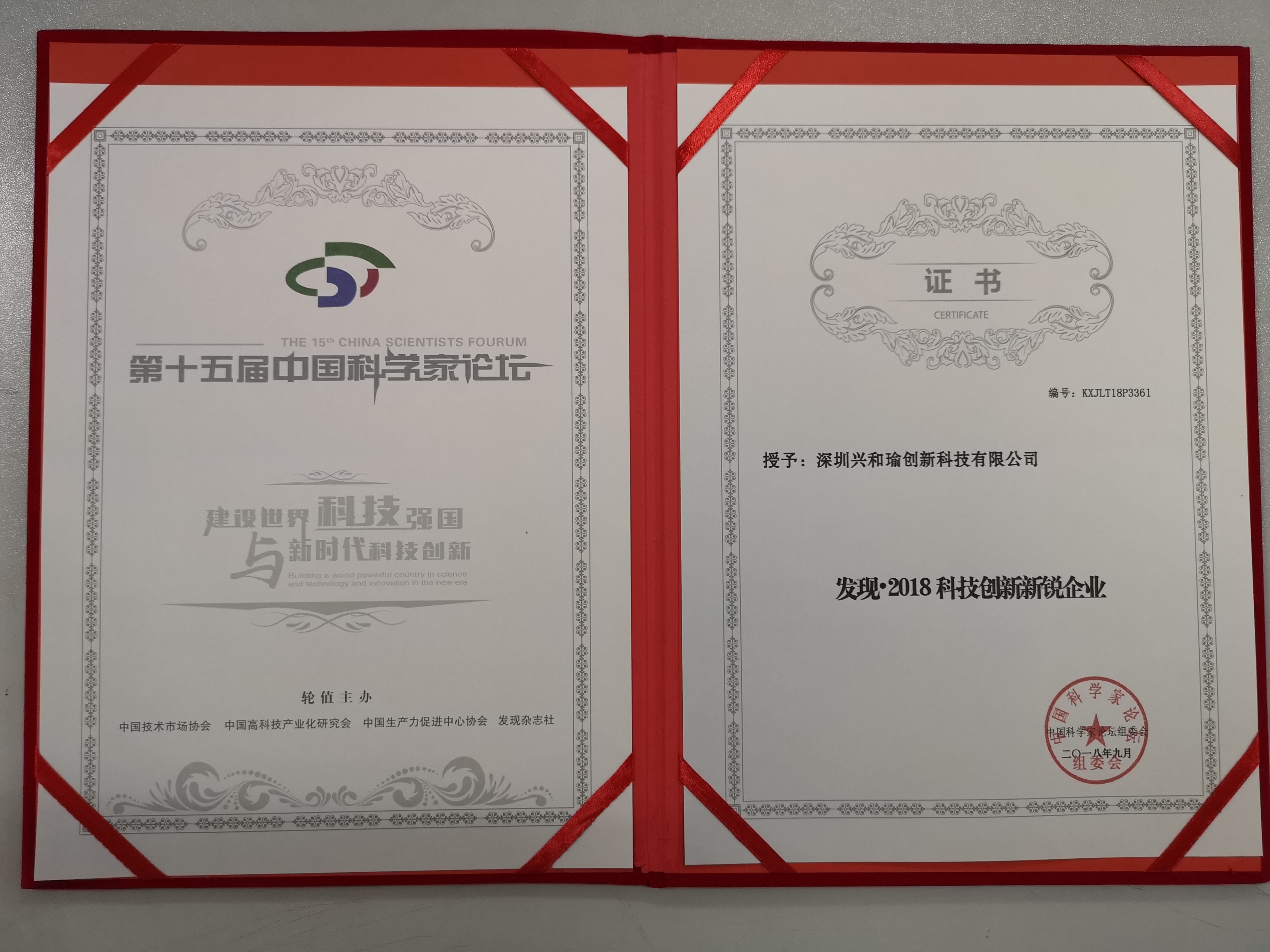 9月12号晚在北京会议中心举办荣誉表彰晚会,经过本次大会提名和组委会审议,由于在科学技术理论与应用研究及科学技术推广普及工作中做出的突出贡献,深圳兴和瑜创新科技有限公司荣获“发现·2018科技创新先进单位”、 “发现·2018科技创新新锐企业”权威奖项。这也预示着兴和瑜作为一家成立不久的创新企业,已经在高新科技领域拥有了强大科研专利技术能力,达到了《第十五届中国科学家论坛》以创新主题中建立创新链不同环节的功能定位。